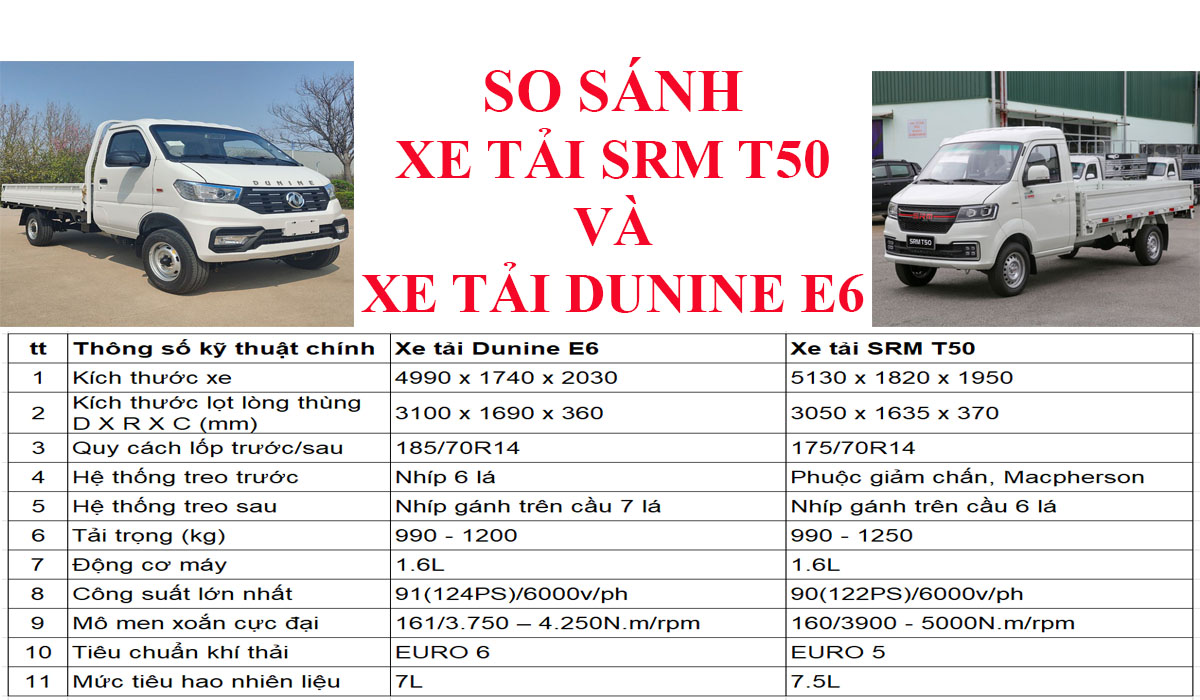 - Từ bảng trên có thể thấy, hai động cơ này có công suất máy, mô men xoắn tương đương nhau đều ứng dụng công nghệ kỹ thuật hiện đại như công nghệ kỹ thuật van biến thiên thông minh i-VVT, công nghệ kỹ thuật phun xăng điện tử đa điểm của động cơ xe SRM T50 và công nghệ kỹ thuật (GDI) phun xăng trực tiếp vào buồng đốt động cơ của xe Dunine E6 hoặc là đều sử dụng cam xích bền bỉ. Tuy nhiên, vòng tua máy của động cơ xe tải Dunine E6 lại thấp hơn so với của động cơ xe tải SRM T50, vì vậy nên xe tải Dunine E6 sẽ chạy tiết kiệm nhiên liệu hơn so với xe tải SRM T50 bởi bản chất của việc tiết kiệm nhiên liệu nằm ở vòng tua máy thấp.