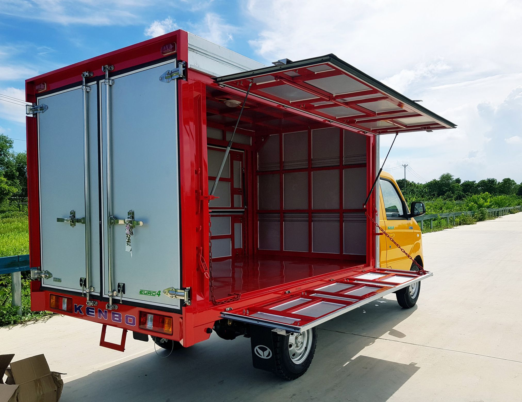 Ngoài kiểu thùng trên, xe tải KenBo còn thiết kế kiểu thùng mở bửng rất thuận tiện để bày bán hàng lưu động.